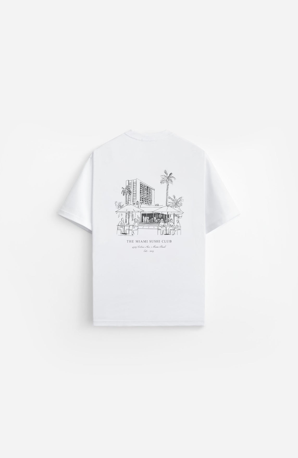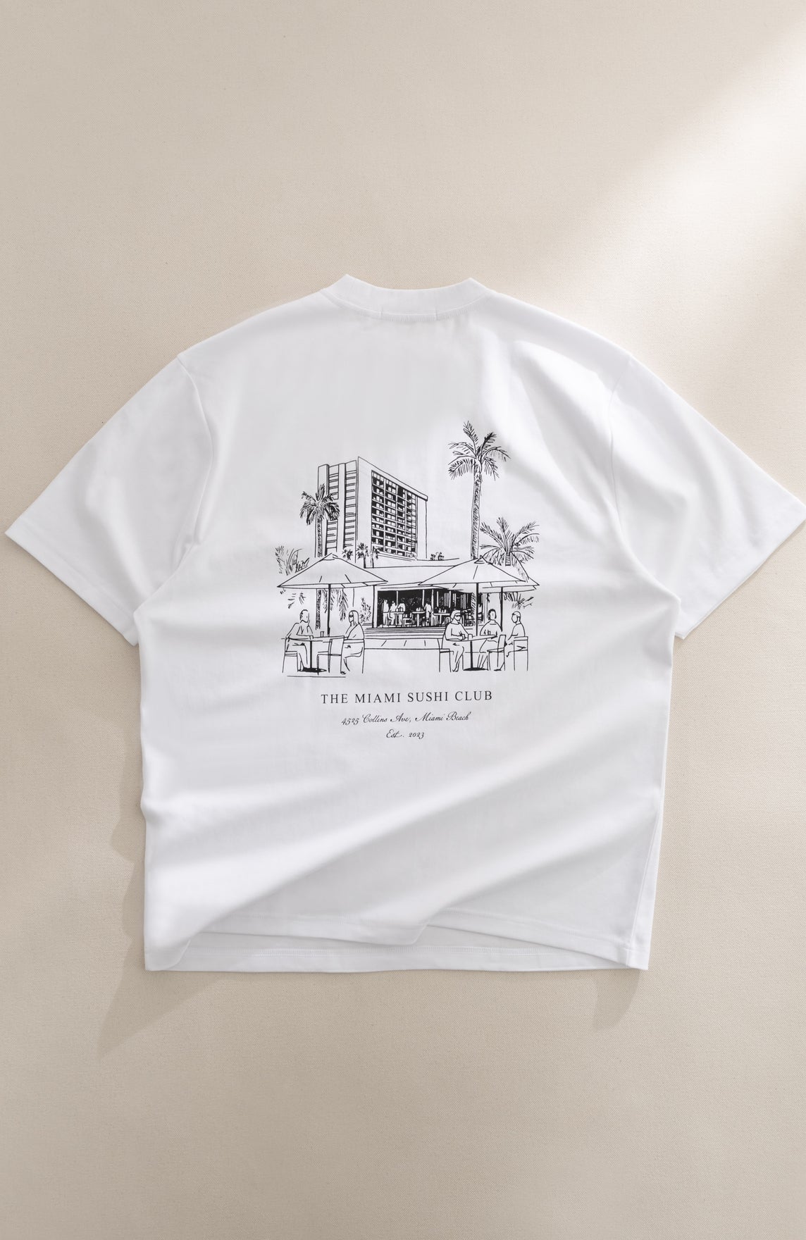 Miami Sushi Club Graphic printed on center back.