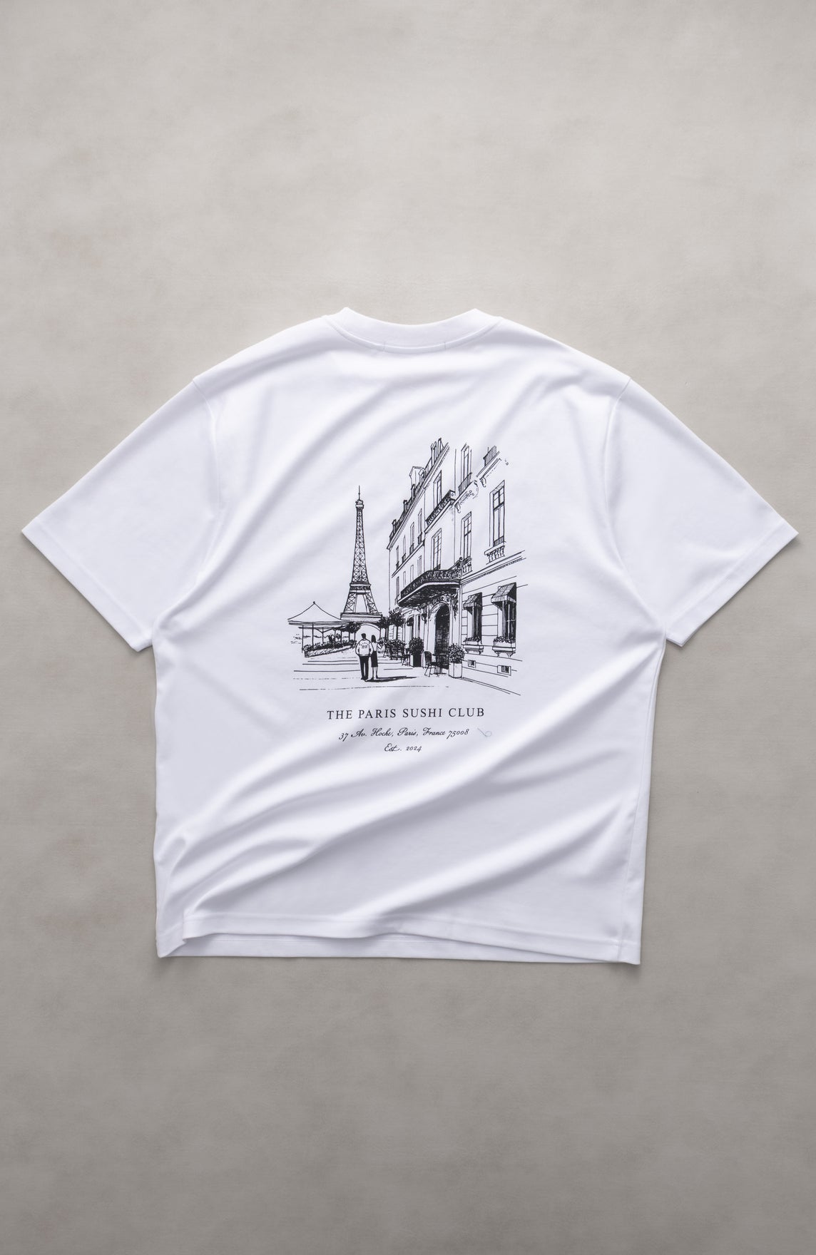 Paris Sushi Club Graphic printed on center back.