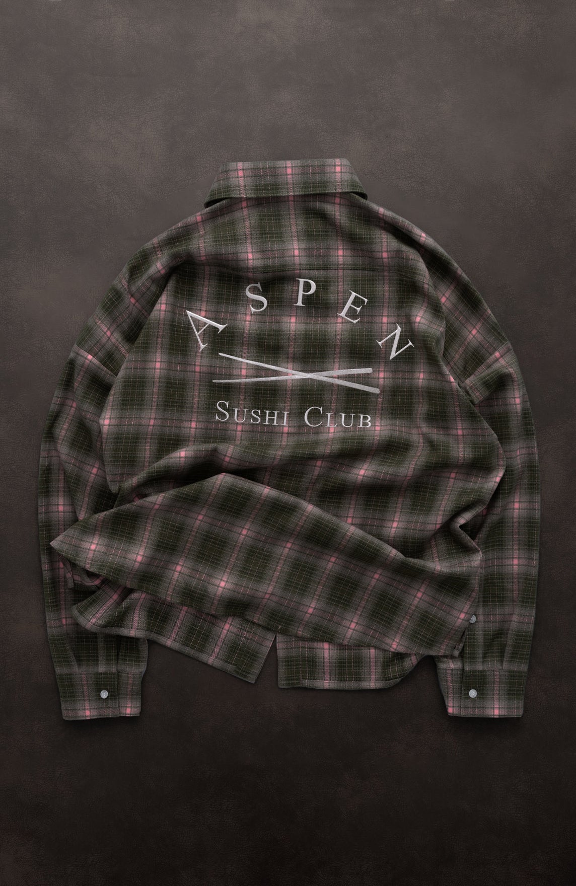 Aspen Sushi Club small embroidery on wearer's front lower left side.